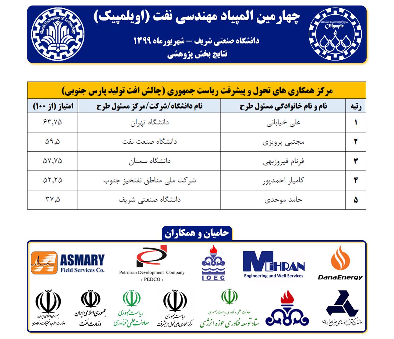 مراسم اختتامیه چهارمین دوره المپیاد علمی – پژوهشی مهندسی نفت با حضور مدیران ارشد معاونت علمی و فناوری ریاست جمهوری، وزارت نفت، شرکت ملی نفت ایران، اساتید دانشگاه ها و حامیان آن در تاریخ 27 شهریورماه 1399 به میزبانی دانشگاه صنعتی شریف برگزار شد.