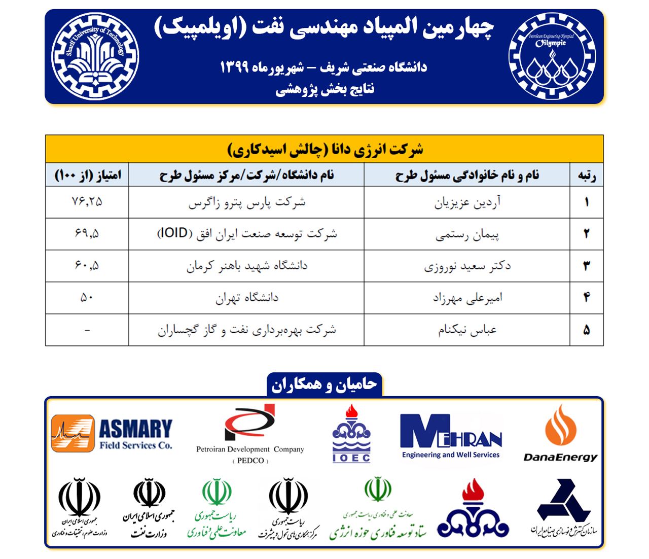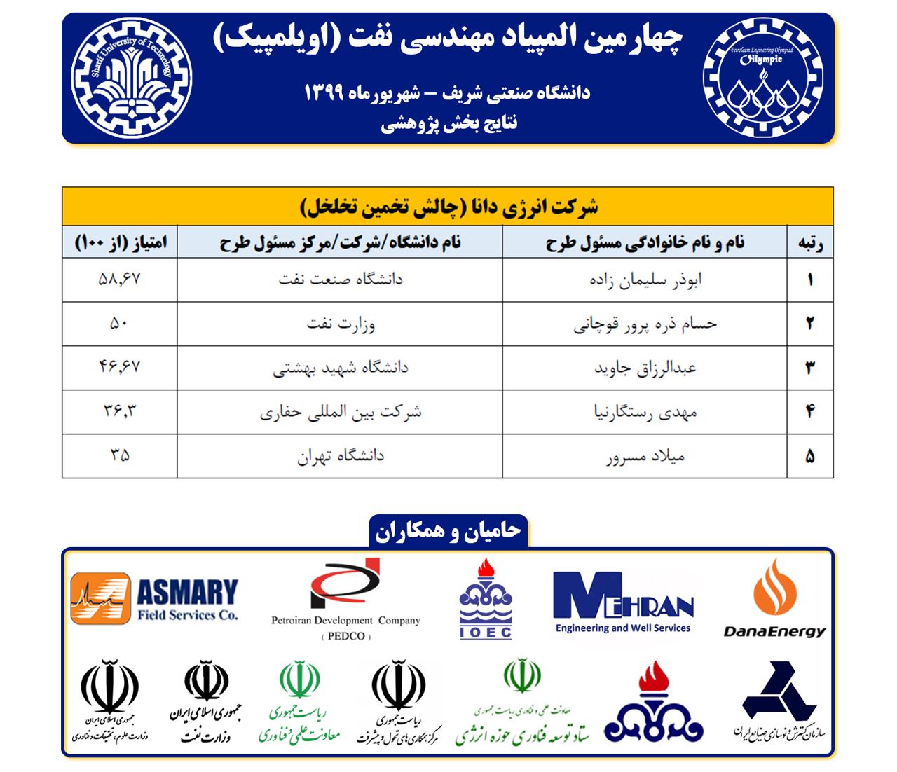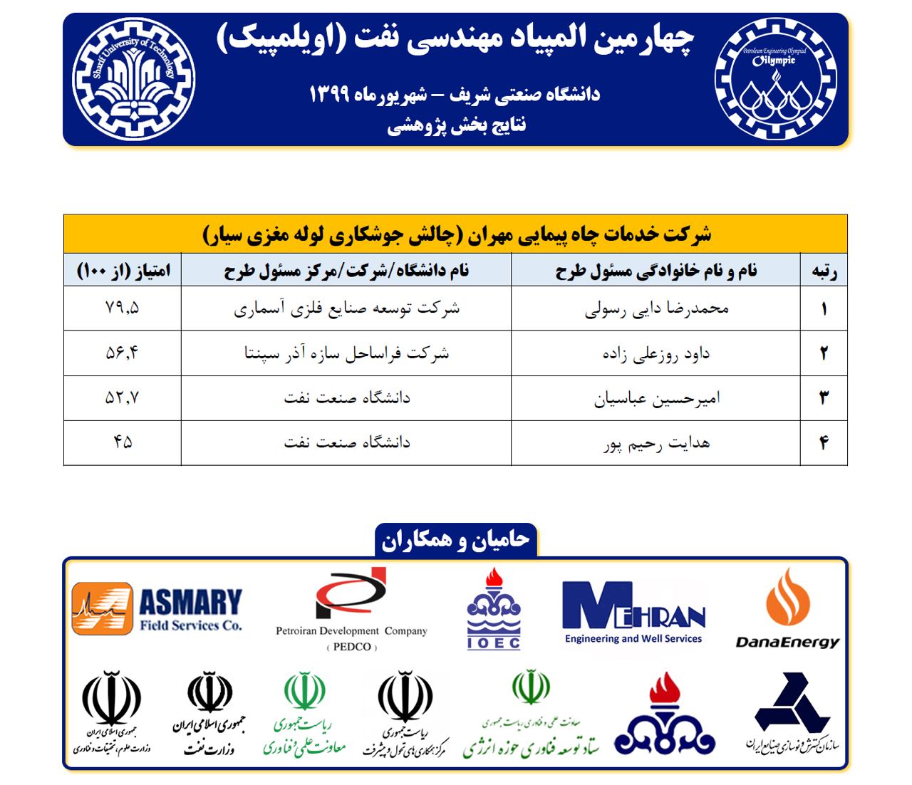 چهارمین دوره المپیاد علمی – پژوهشی مهندسی نفت با حمایت و همکاری معاونت علمی و فناوری ریاست جمهوری، وزارت نفت، وزارت علوم، تحقیقات و فناری، مرکز همکاری های تحول و پیشرفت ریاست جمهوری، شرکت ملی نفت ایران و نیز ستاد توسعه فناوری حوزه انرژی، در دو بخش علمی و پژوهشی و با هدف توسعه فرهنگ کارآفرینی، به صورت ارائه مجازی ۱۷ تیم منتخب، تحت نظر ۱۱ داور محترم دانشگاهی/صنعتی برگزار شد.